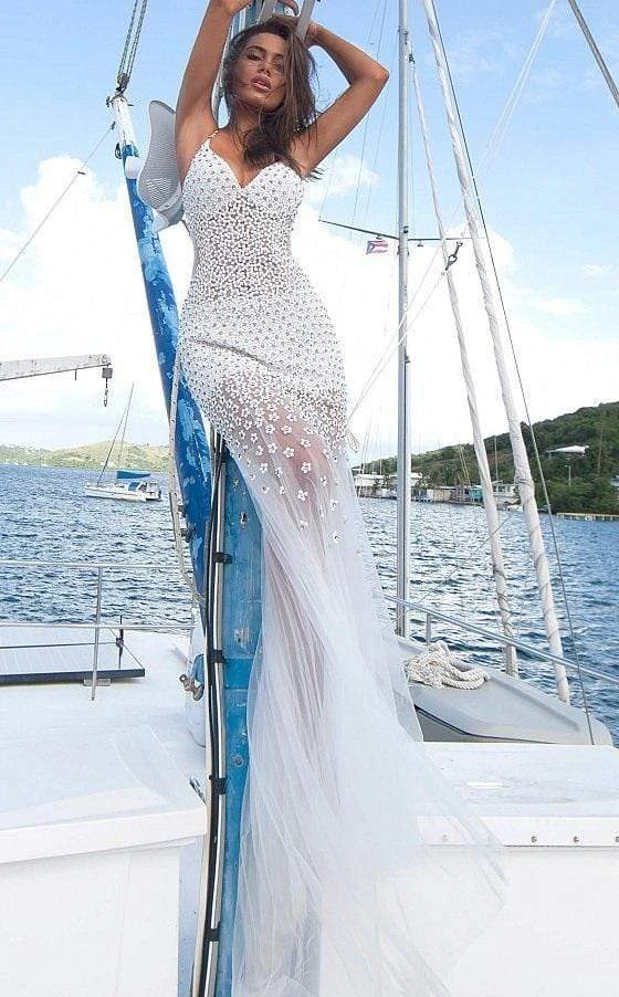 Stand out in every occasion with this daring creation by Jovani 60695. Fashions a sleeveless, plunging V-neckline with spaghetti straps. The fitted bodice is richly decorated with bead embellishments that cascade down the sheer tulle trumpet skirt. The back flaunts a V-shape and is designed with an invisible back zipper. The skirt completes the look in a sweep train finish for added drama. Look jaw dropping in this dramatic dress by Jovani. Model is wearing Off-White color.