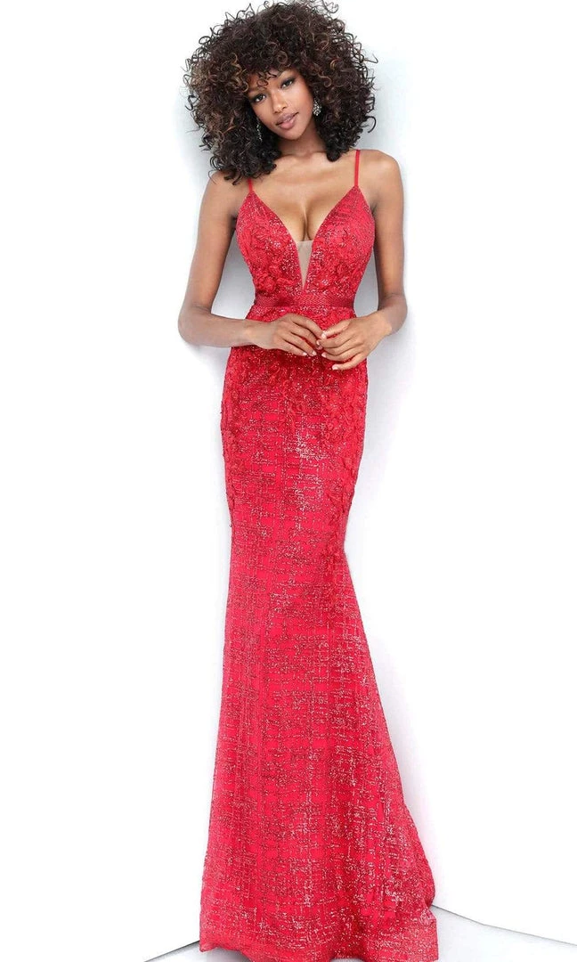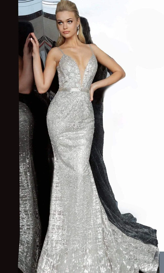 Exude a charm that is meant to mesmerize the elite crowd in this gorgeously decadent dress from Jovani 62517. This sleeveless ensemble spellbinds in a plunging V-neckline with mesh panel. The fitted bodice is richly decorated with embellishments and embroidery. The waist is accentuated with a beaded belt while the back fascinates in a V-shaped open back. The skirt has a fit and flare silhouette and adds drama with a sweep train finish. Feel gorgeous when you walk into the party wearing this Jovani creation.Â