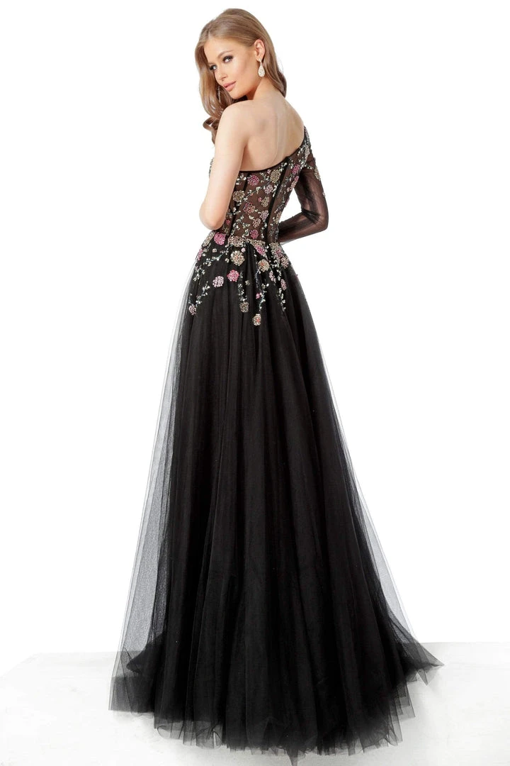 Flatter your figure with this eccentric design by Jovani 66344. This long A-line dress has a very unique and sexy design with its asymmetric neckline and bead appliques on a see-through top. Corset is added on this dress to highlight your figure. The silhouette is A-line and is made with tulle skirt and a thigh-high slit is styled. Be in this gorgeous Jovani creation and leave a lasting impression. Find more homecoming dresses!