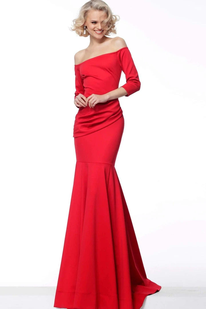 This posh party gown by Jovani 68416 puts you in the spotlight. This alluring dress flashes in an off the shoulder neckline with a ruched bodice. The skirt is tailored in a full length mermaid silhouette with a sweep train finish. Make yourself into a vision of loveliness in this spectacular full length gown by Jovani. Model is wearing Red color.