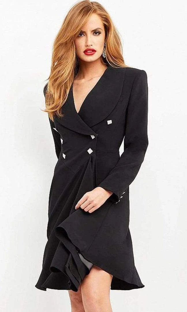 Be ready to fascinate everyone in this dress by Jovani M04302. Show off your French styled dress with its wrap style collared dress. It uses crystal buttons on the bodice and features long sleeves and V neckline. Skirt is in A-line silhouette. This Jovani is perfect on your next formal event!