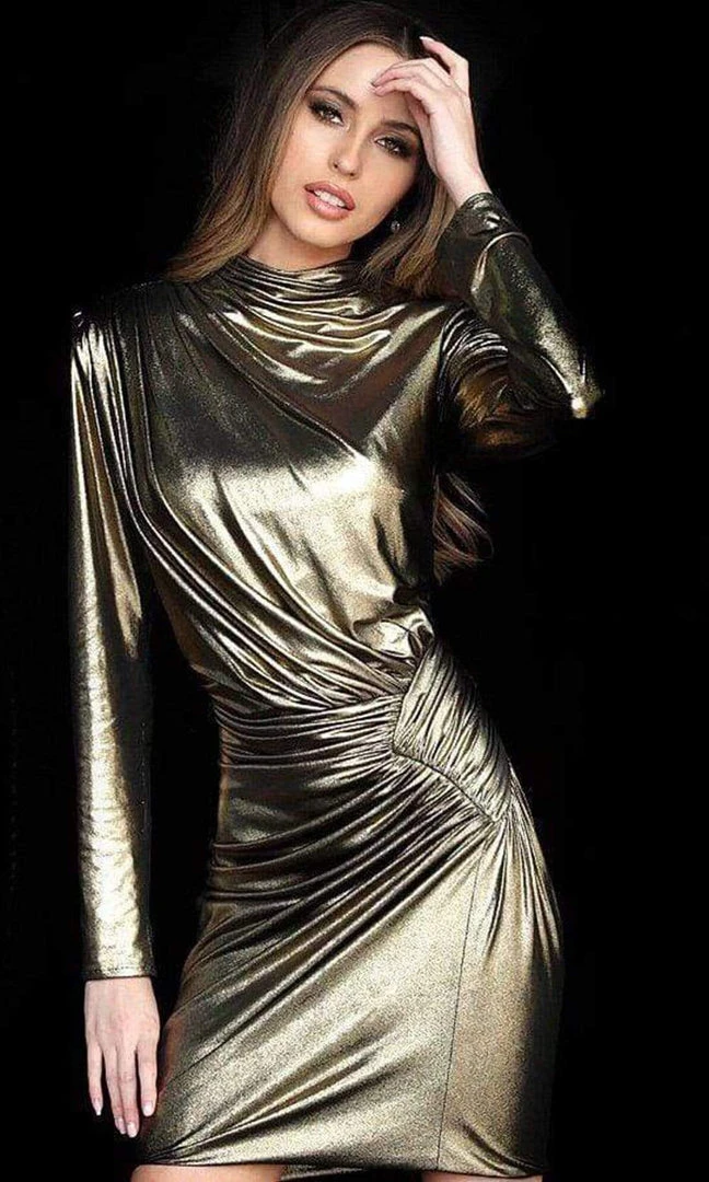 Get ready for everyone to stop and stare when you show up in this Jovani M1702. Shine as you wear this dress made with metallic fabric. It presents in high neckline and long sleeves while the bodice is fitted that flatters your figure with an effect of ruch. This dress is in sheath silhouette. Be in this gorgeous Jovani creation and leave a lasting impression. Model is wearing Gold color.