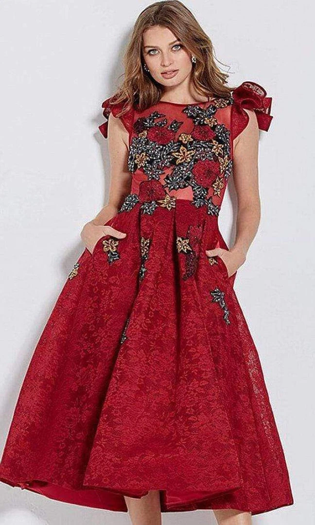 Dance the night away in this majestic Jovani M59787 masterpiece. This tea length dress features a bateau neckline and a butterfly sleeves. It has a floral appliqued design and the skirt is made with floral lace fabric with pleated design. The side pockets are added to the dress for more charming look. No matter what hair style or dress style you choose as long as you’re wearing Jovani creation, everything will be amazing.