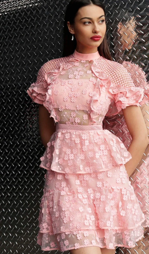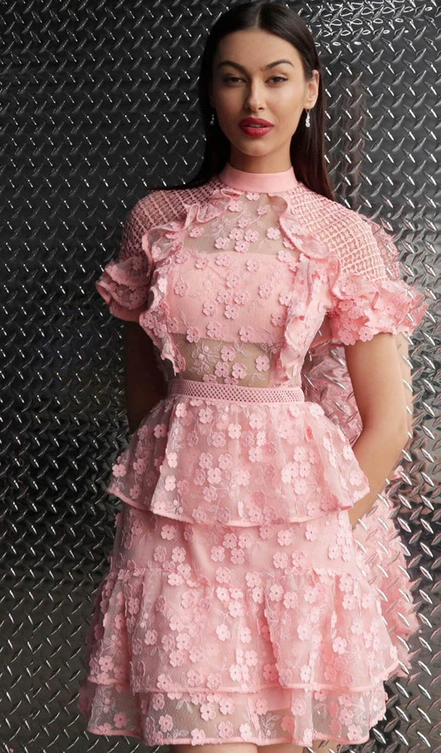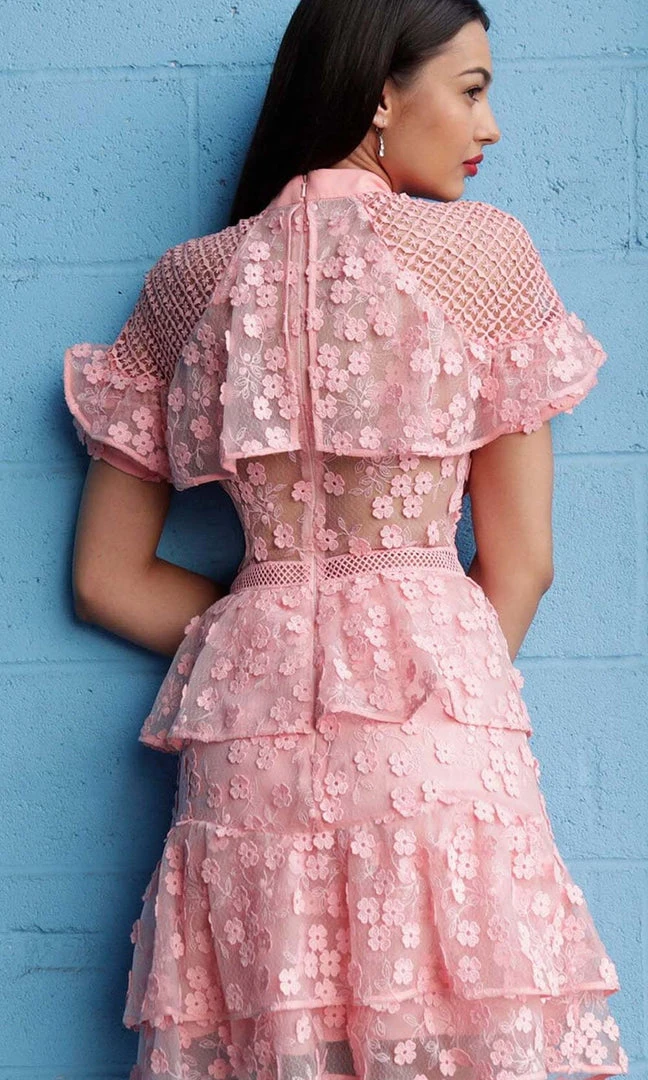 Be strikingly gorgeous in this dress by Jovani M61446. Glams in a high neckline with short sleeves. The dress is ornate with lace and floral appliques. The sheer fitted bodice flourishes a mid-thigh layered A-line skirt with a ruffled hemline. Show off your bubbly personality in this cocktail dress by Jovani. Model is wearing Pink color.