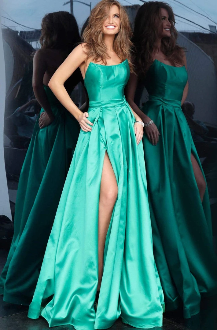 Promote attention-grabbing style in this stunning look by Jovani JVN67858. This gorgeous gown showcases a strapless, scoop neckline with pointed details. The fitted bodice shows off a mid-open back. The pleated skirt flourishes a ballgown silhouette with a high slit and a sweep train finish. This Jovani gown is perfect for any formal evening. Model is wearing Green color.