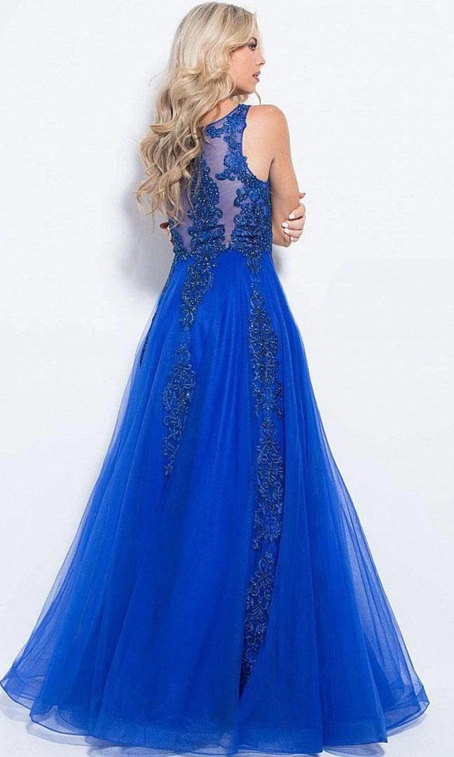 The fitted bodice boats a jewel neckline with sleeveless cut and sheer back panel. Stunning embellishments adorn the bodice and tulle crafted A-line skirt. This dress is floor length finished in horsehair hem.