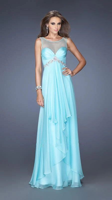Create a perfect evening wearing this elegant evening dress by La Femme 20026. The illusion jewel neckline bodice has thick straps and a sweetheart lining for a chic look. Ruched to the empire waist and cinched with a dazzling rhinestone ribbon, this fashionable ensemble cascades to the full-length hemline in long, ruffled layers. This La Femme creation is simply captivating!