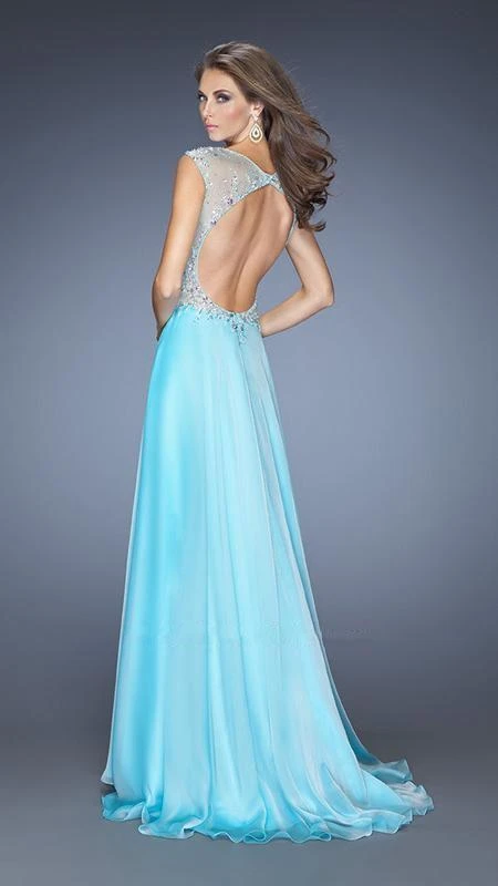 Emanate that radiant goddess vibe in this dreamy chiffon masterstroke by La Femme Gigi 20074. Embellished with multi-shaped iridescent jewels and beads, the lavish sheer bodice features a bateau illusion neckline on a bandeau base, cap sleeves and a lovely display of ornate mesh open back with an oval cutout. Dripping with sparkling crystals on its natural waistline, its opaque skirt tumbles to a full-length hem and a sweep train. Give off a sophisticated yet vibrant feel every time you dress in this magnificently made creation by La Femme Gigi. The images only represent this gown in the Aqua color.