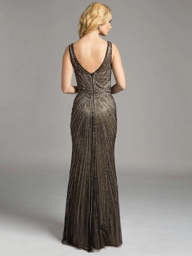 | Details: | Sleeveless, Fully Beaded, Vertical Linear Pattern, Deep V-Cut Back, Embellished Waistband, Full Length Hem |