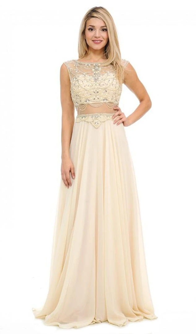 Walk in a defined sophistication and beauty wearing Lenovia 8121. This two piece ensemble features a sleeveless, illusion bateau neckline with crop top lavishly adorned with glittering crystal beading. The crop top has an open back corset while the chiffon skirt shows a flowy A-line silhouette and runs at full length hem. The dress is complemented with a matching chiffon scarf. This Lenovia style is your excellent pick when you dare to look stylishly spectacular.
