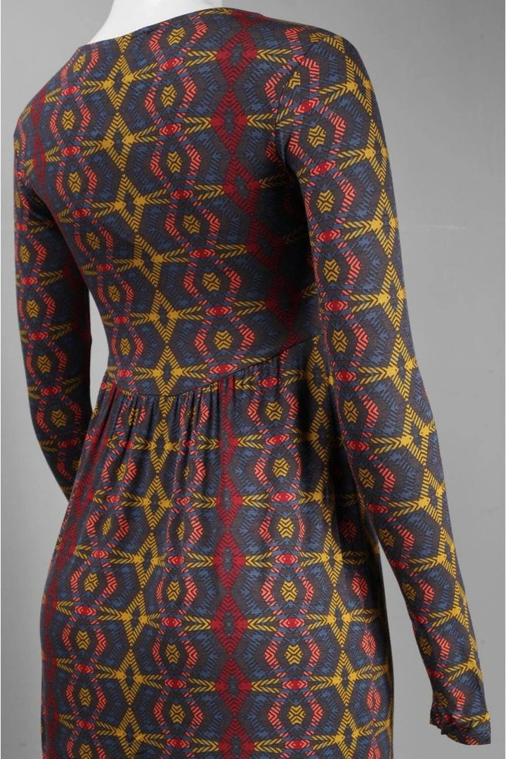 Go fancy yet carefree with this knee length dress by Leota 2451. The printed rayon dress features a long sleeve, V-neckline, ruched bust, and cinched empire waistline. The fitted bodice moves into a straight skirt with a modest hem. Whether you’re home by curfew or keep the party going all night, this Leota knee length dress is the perfect party companion! The model is wearing a Feather Plad color.