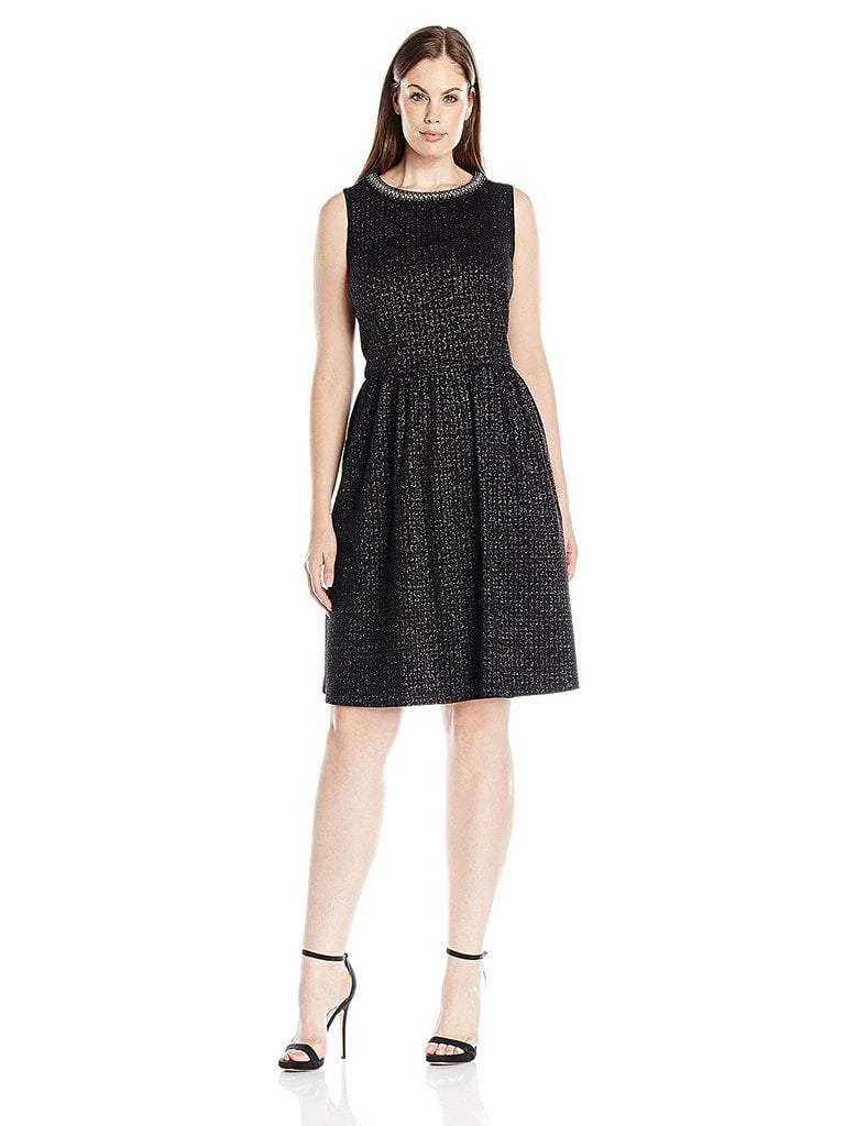 | Details: | Metallic Knit, Sleeveless, Full Back, Back Zipper Closure, Embellished Neckline, Short Hem |