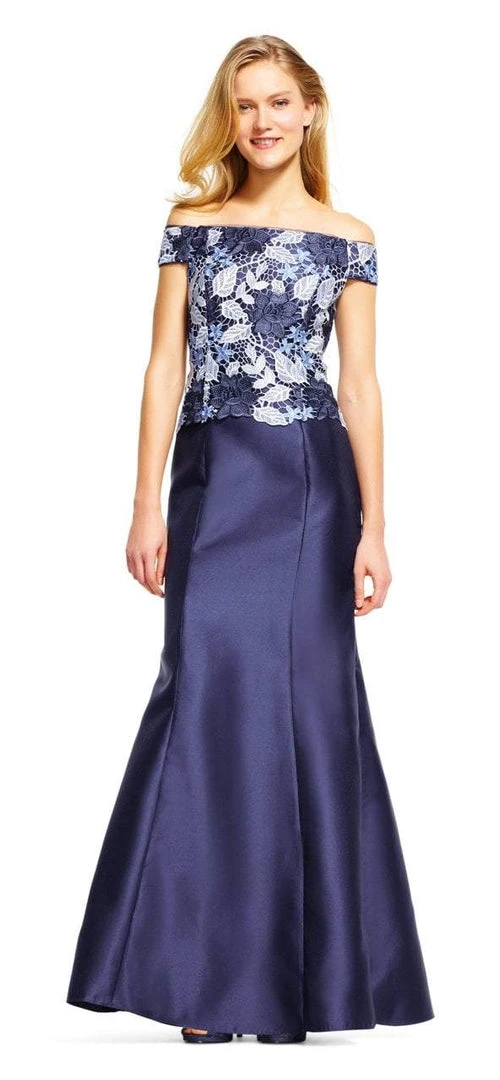 Turn heads instantly when you wear this formal Mikado gown from Adrianna Papell AP1E201247. This dress features an off the shoulder neckline, tri-color floral lace bodice with stunning hem detail, and a voluminous mermaid skirt. Fitted in all of the right places, this gown is simple yet full of impact. Sparkling accessories will complete this sophisticated look from Adrianna Papell that is perfect for galas to mother of the bride or groom moments.