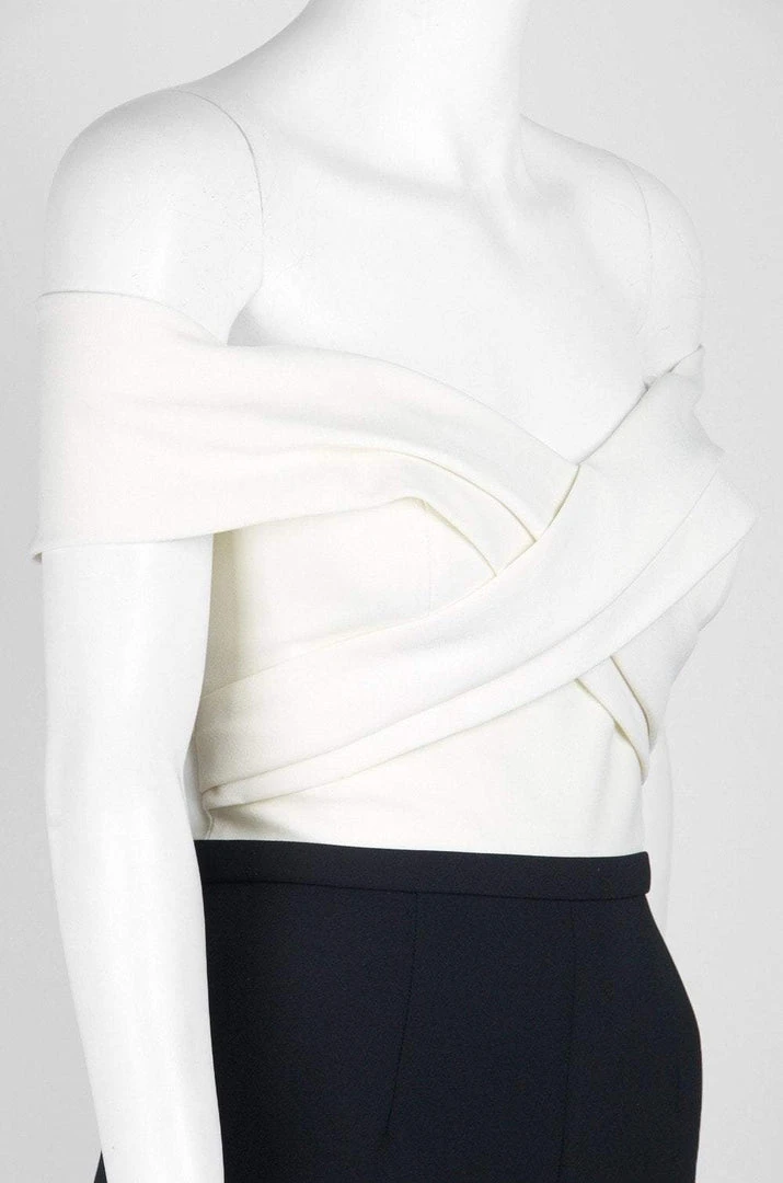 Flatter your feminine form with a sexy yet chic Theia 883335 creation. Designed with crisscrossing pleats accenting the strapless bodice, this style shows an off shoulder neckline and a foldover open back. A pair of contrasting straight pants columns into a full-length style. Frame your refined assets and dominate in this Theia masterpiece.