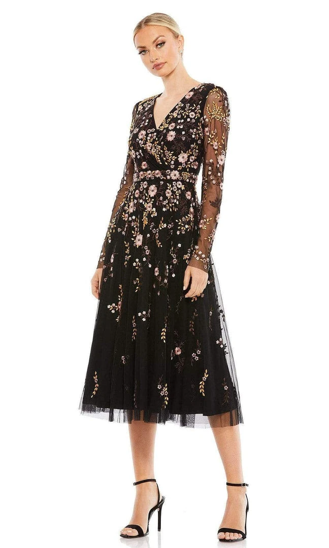 Be the loveliest of them all wearing Mac Duggal Cocktail 35103 dress. Beautifully designed with floral embroidery, this dress showcases a V neckline and sheer long sleeves. The A-line skirt reveals a gathered detail and sheer overlay as it cascades down to tea-length hemline. Be the ultimate belle of the party in this gorgeous creation from Mac Duggal.