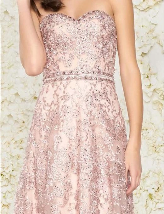 | Details: | Strapless, Sweetheart neckline, Lace overlay fabric, Beaded waistband, A-Line sheer gown, Back zip closure, Sweep train |