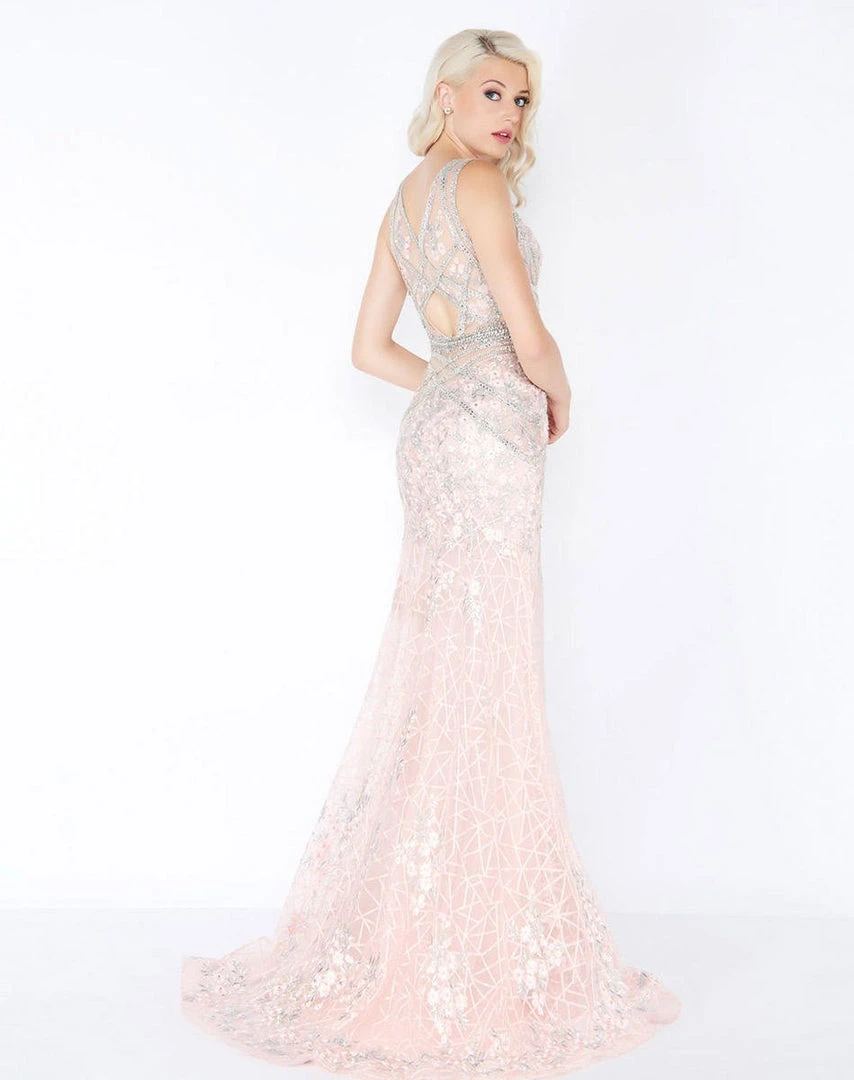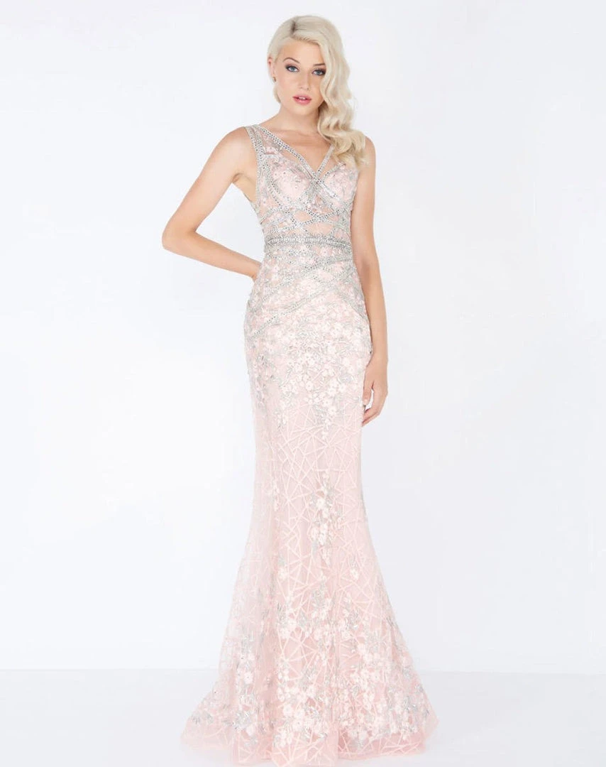 Fashion forward and fabulous, this dazzling evening dress from Mac Duggal Prom 50471 is sure to make them stare. The sleeveless bodice has a flattering v-neckline and shimmers with twinkling beaded embellishments in a sweet strappy pattern. Cinched with a sparkling belt, this enchanting ensemble glides to the full-length hem in amazing floral adorned waves. This Mac Duggal creation definitely flatters from every angle.
