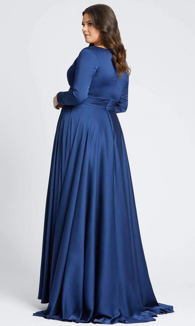 Let your look be the topic of conversation in a vocal dress from Mac Duggal 55290 . This dress parades a v-neck neckline and long sleeves. It has ruched design in the waistline and it is made with metallic fabric. It has high slit for a sexy walk. The back is secured zipper. Radiate a fresh style as you orchestrate a dramatic entrance in this radiant metallic dress by Mac Duggal.
