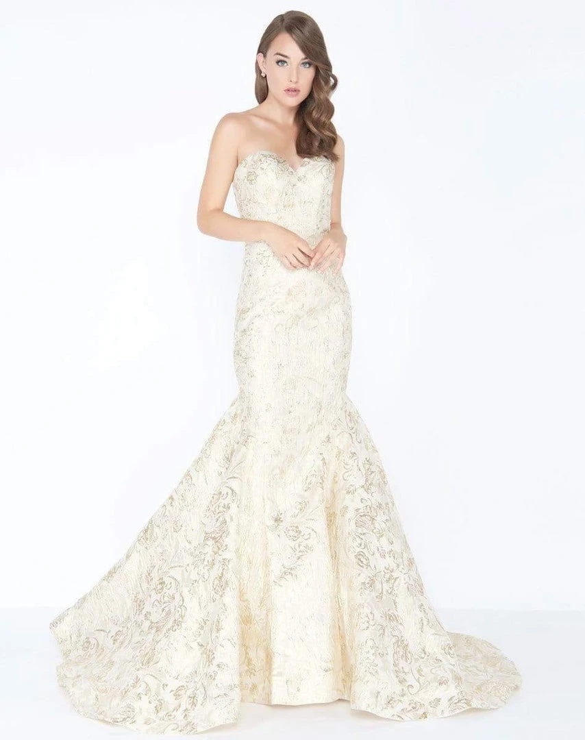 | Details: | Strapless, Metallic brocade bodice, Mermaid skirt, Mid-open back, Back zip closure |
