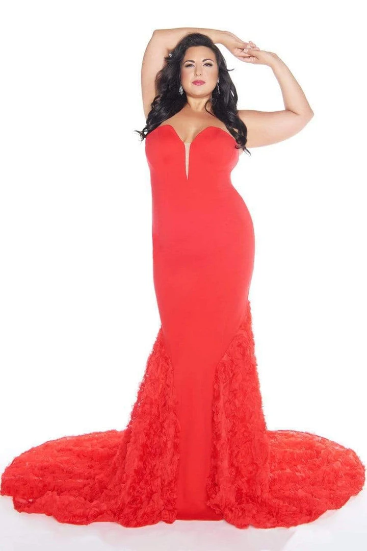 | Details: | Strapless, Jersey, Plunging neckline, Sheer inset, Chiffon, Rosette fabric train, Mermaid skirt |