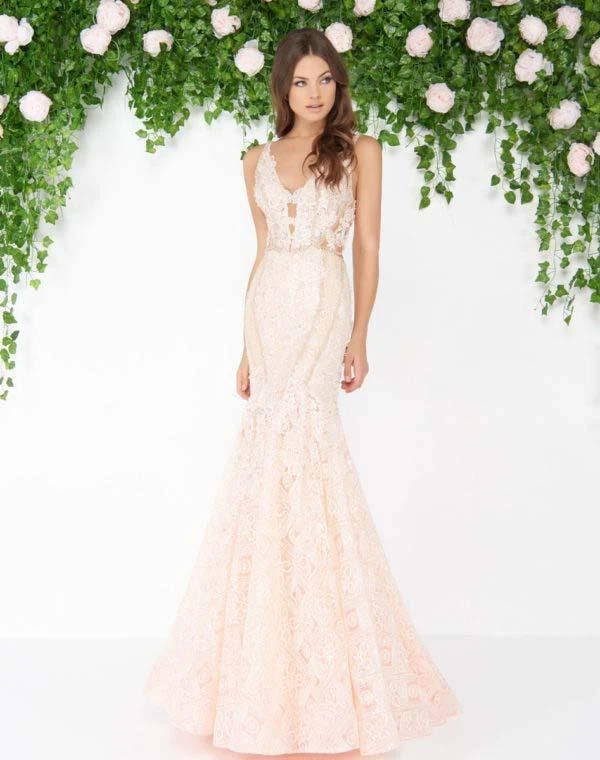 | Details: | Sleeveless, Sequins, Lace appliques, Scoop back, Front and back cutout, Illusion fabric, Rhinestone and pearl accents, Trumpet skirt, Sweep train |
