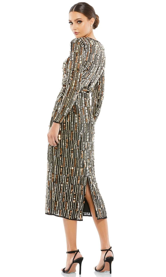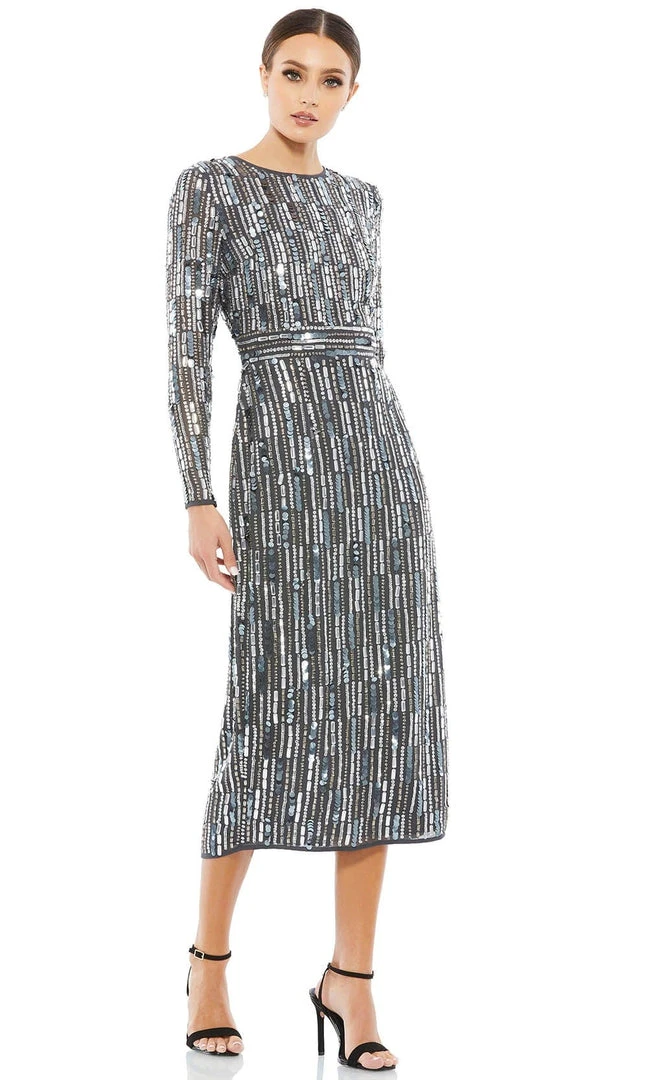 Create an impact when you walk in in this exquisite Mac Duggal 93590 creation. Gleaming with an array of stripe rendered iridescent sequins, this long sleeve dress impresses with a jewel neckline and a full back. Accented with trailing embellishments, the sheath skirt sculpts into a tea length hemline. Expect to be turning heads as you walk by in this Mac Duggal masterpiece. Exquisite attention to detail is the hallmark of Mac Duggal dresses. Mac Duggal dresses encapsulate the very essence of the women who wear them, reflecting their confidence, feminine power, and inner beauty.