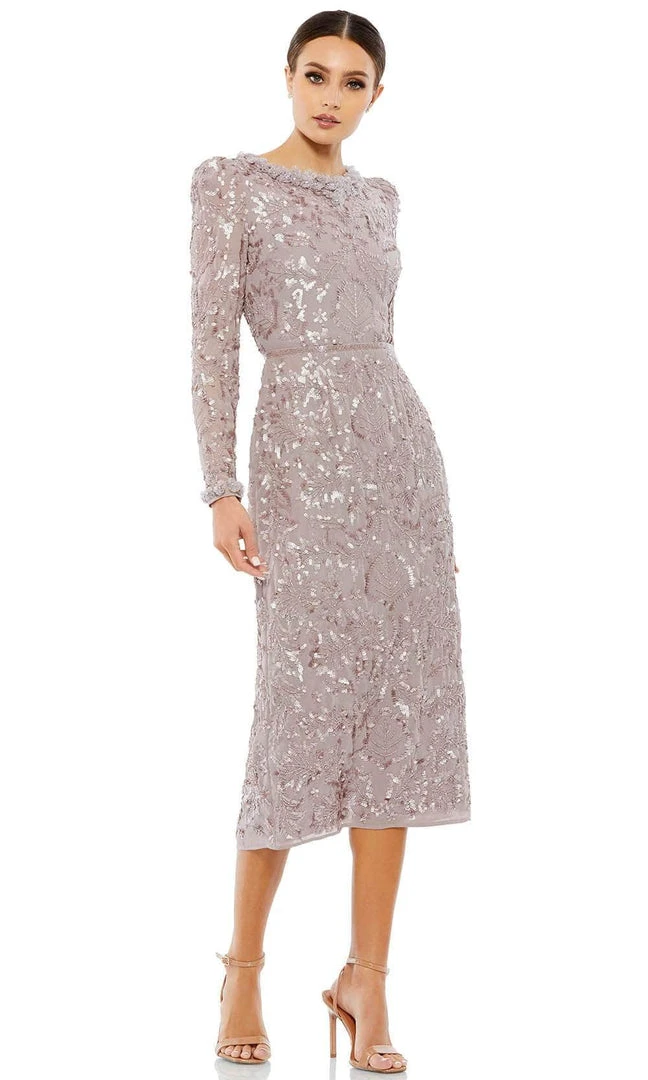 You will never cease to amaze in this captivating dress by Mac Duggal 93595. The dress is tailored with patterned sequins and has a floral-appliqued jewel neckline as well as long sleeves with ruffled cuffs. With a bugle beaded waistband, this fitted midi dress is finished with a slit down the center of its back. Be swept away by the romance of this Mac Duggal dress that a stunning look for your evening occasion! Exquisite attention to detail is the hallmark of Mac Duggal dresses. Mac Duggal dresses encapsulate the very essence of the women who wear them, reflecting their confidence, feminine power, and inner beauty. Model is wearing Mauve color.