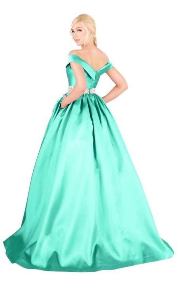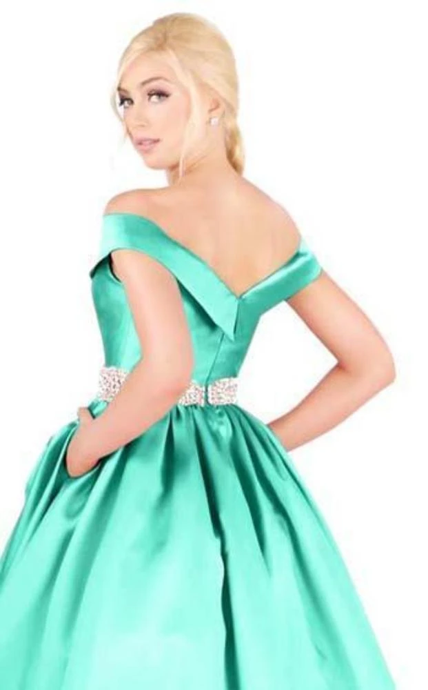 | Details: | Folded Off shoulder neckline, Cap sleeves, Princess seams, Embellished Belt, Back zipper closure |