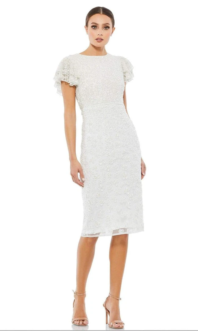 Indulge yourself in an upscale glamour in this Mac Duggal 10827 creation. Flourishing a floral rendered sequin motif, this flutter sleeve dress reveals a jewel neckline and a full back. Accented with a back slit, the sheath skirt streams to adhere at a tea length hemline. Navigate the room in style in this Mac Duggal masterpiece.