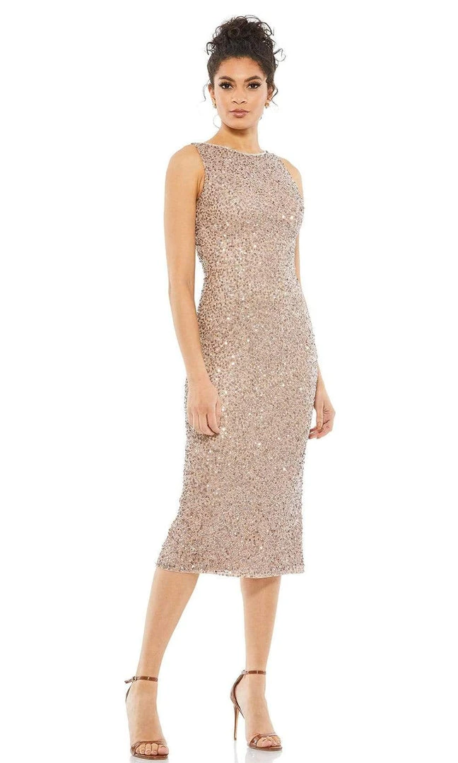 Put a sparkle in his eyes in this mesmerizing Mac Duggal 5526 creation. Crusted with sequins accenting the sleeveless silhouette, this beauty flaunts a jewel neckline and a full back. Skimming the feminine form, the sheath skirt opens with a back slit and streams into a tea length hem. Parade regal elegance and attract attention in this Mac Duggal masterpiece.