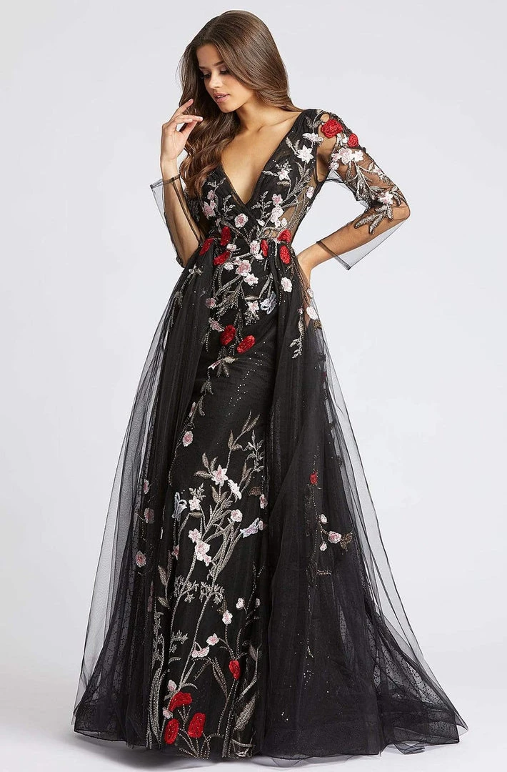 Look irresistibly beautiful in this long dress by Mac Duggal Couture 20125. Graces in a deep V-neckline with sheer quarter length sleeves. Floral embroidery on the bodice that cascade to the skirt gives color and texture. The dress has a low scoop open back and flourishes a full length A-line skirt with sweep train finish. Leave everyone speechless when you enter the room in this Mac Duggal design. Find more evening dresses!