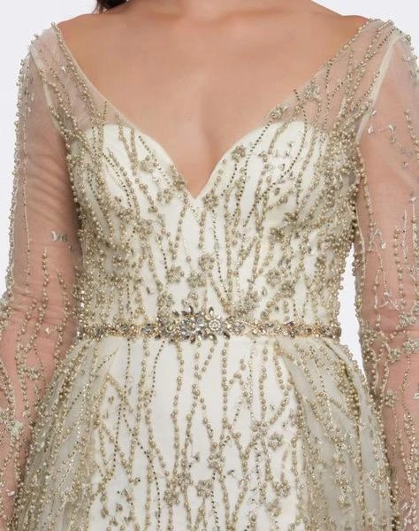 Shimmer and shine in an ethereal masterpiece from Mac Duggal Couture 50553. Glams in a plunging V-neckline with sheer long sleeves. The back shows a low V-cut and fitted bodice ornate with embellishments. The trumpet skirt begins from the waist and is complemented with a floor length overskirt with sweep train finish. Waltz into the party and feel like a queen in this Mac Duggal ensemble.