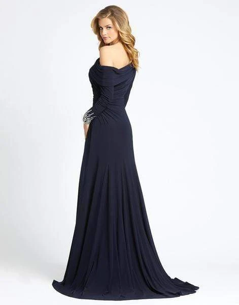 Make magic in this idyllic night in this refined Mac Duggal 12231D creation. Gathering with fine shirring along one side, this beauty captures an asymmetrical neckline with a soft pleated panel. Slanted with a mid-open back and framed with jeweled long sleeves, the flared skirt parts with a high slit and flows floor-ward to a sweeping train. Get noticed without qualms in this stunning Mac Duggal masterpiece. Find more evening dresses!