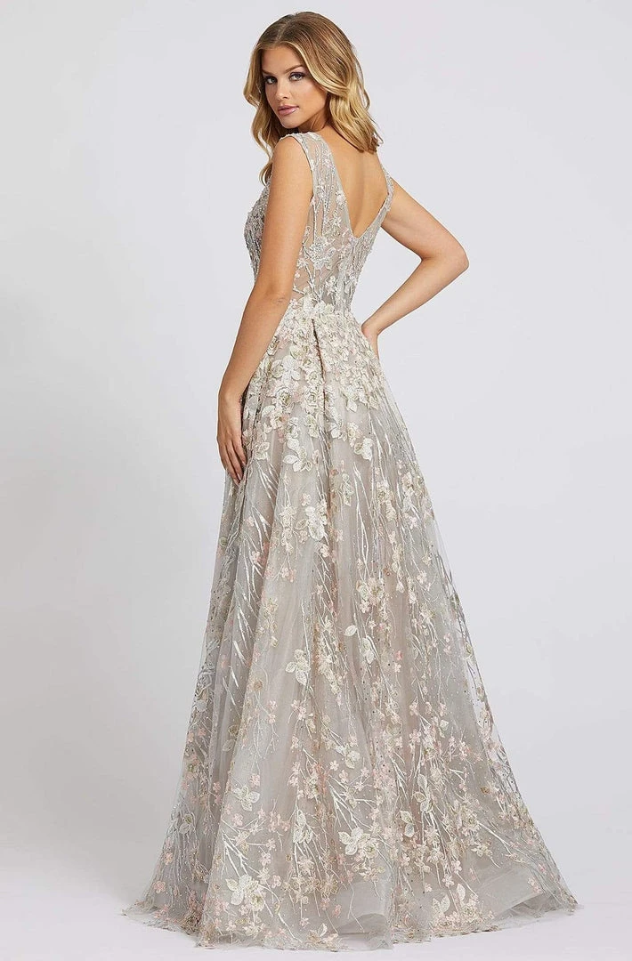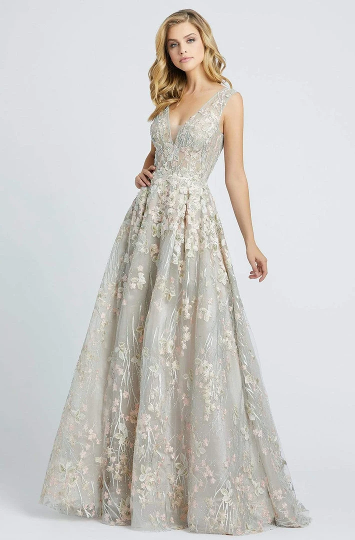 Showcase your femininity in this absolutely attractive evening dress by Mac Duggal 20131. Flawless amount of multi-colored embroidered flowers along with beading beautify the whole ensemble as the fitted bodice features a plunging V neckline with sheer inset detail at the bust, mirrored with a V back. Fabulous pleats cascades the a-line skirt as it ripples to a full length hemline. Decorate a dreamy evening in this wonderful Mac Duggal creation.