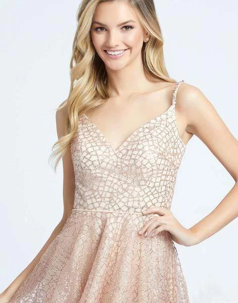 Be the delight of everyone’s eyes in Mac Duggal Evening 67025. Shine and glitter with this glittered cocktail dress. Its strap is beaded with crystals and it has a very thin lace around the waist that completes the look. Dance all night in this dazzling cocktail dress from Mac Duggal Evening.