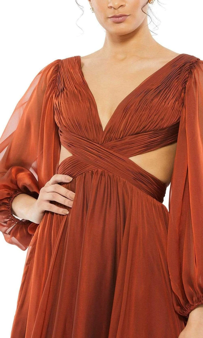 Get ready for everyone to stop and stare when you show up in this Mac Duggal 67948. This flowy and voluminous dress is perfect if you want to appear enchanting and a goddess. It features bishop sleeves while the bodice has cut out and ruched. It exudes a plunging neckline with an open back with crisscross lace-up back. Skirt is in A-line and tiered till it reaches the sweep train. Orchestrate your moment to stand out in this Mac Duggal dress.