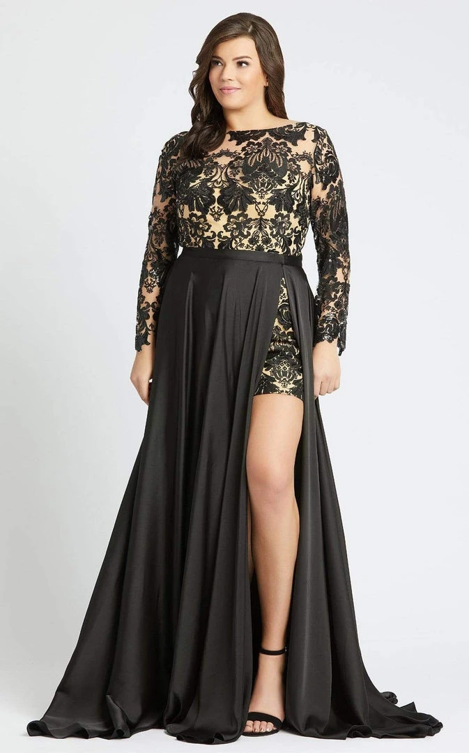 Get to have the power to wow the upscale crowd in this fantastically embellished Mac Duggal Fabulouss 66809 creation. Shimmering with sequins on a Baroque motif lace, this alluring piece reveals a bateau neckline framed with ornate long sleeves. Designed with aa scoop open back, this ensemble completes with a romper trimmed with a scallop-hemline. The solid silk chiffon overskirt parts with a high side slit and ends with a sweep of train. Look regal and simply captivating in this immaculately designed Mac Duggal masterpiece.