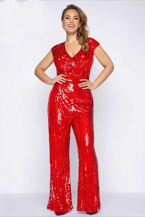 Mac Duggal 4537F brings a sleek vibe to formalwear with this standout jumpsuit. For a non-traditional prom dress choose this cap sleeve with a fully sequined jumpsuit in black or red. This new look from Mac Duggal will blow them all away.
