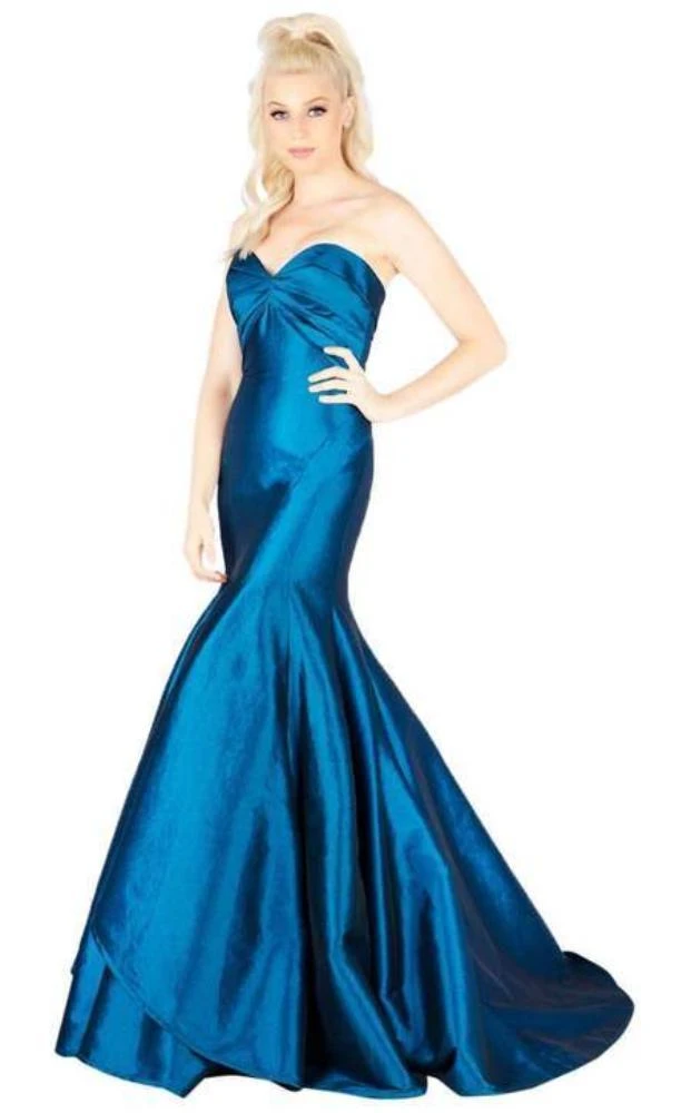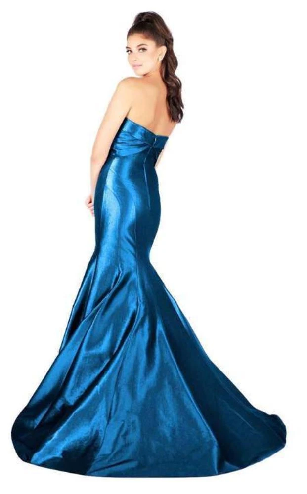 Walk in seduction and style in Mac Duggal 12110. Fashions a strapless sweetheart neckline with pleated bodice. This metallic mesh gown is styled with a form-fitting bodice and flared trumpet skirt that will flatter your figure. This elegant ensemble finishes in a sweep train. This Mac Duggal design will let you celebrate that divine feminine beauty!