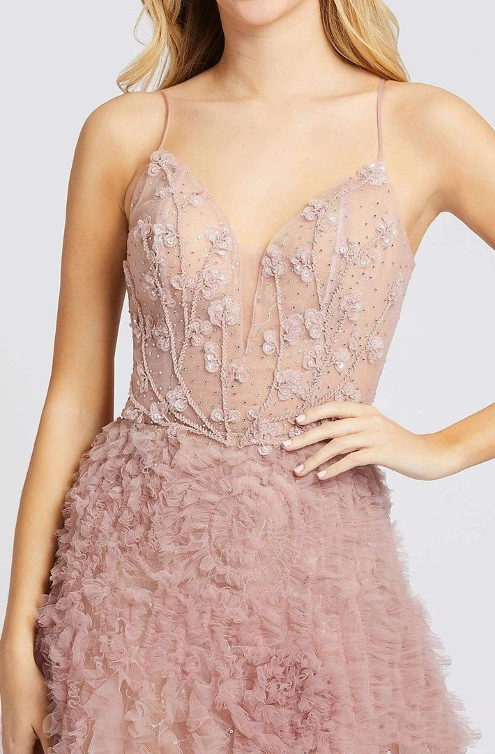 Leave a trail of admirers when you don this Mac Duggal Prom 20193M creation. Stylishly embellished with beaded embroidery and tiny floral appliques on a lace bodice, this gown shows a plunging sweetheart neckline with an illusion inset. Stringed with spaghetti straps and rendered with a sheer scoop back, the A-line skirt flourishes shirred tulle that texturizes its lush flare and train. Look unforgettably beautiful in this Mac Duggal masterpiece.