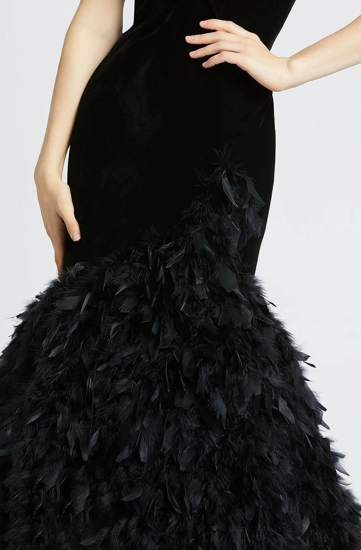 Be ready to catch everyone’s eyes in this dress by Mac Duggal Prom 67313. Shows off an off the shoulder neckline with fitted bodice and a back zipper closure. The feathered skirt forms a mermaid silhouette with a sweep train finish. This Mac Duggal dress is sure to make you the darling of the party!