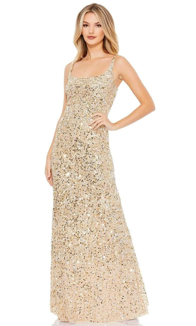This sequined dress allures in a sleeveless, scoop neckline with thin shoulder straps. The fitted bodice has a scoop back and a zipper closure. The skirt forms a flattering sheath silhouette and runs at full length. Model is wearing Gold color.