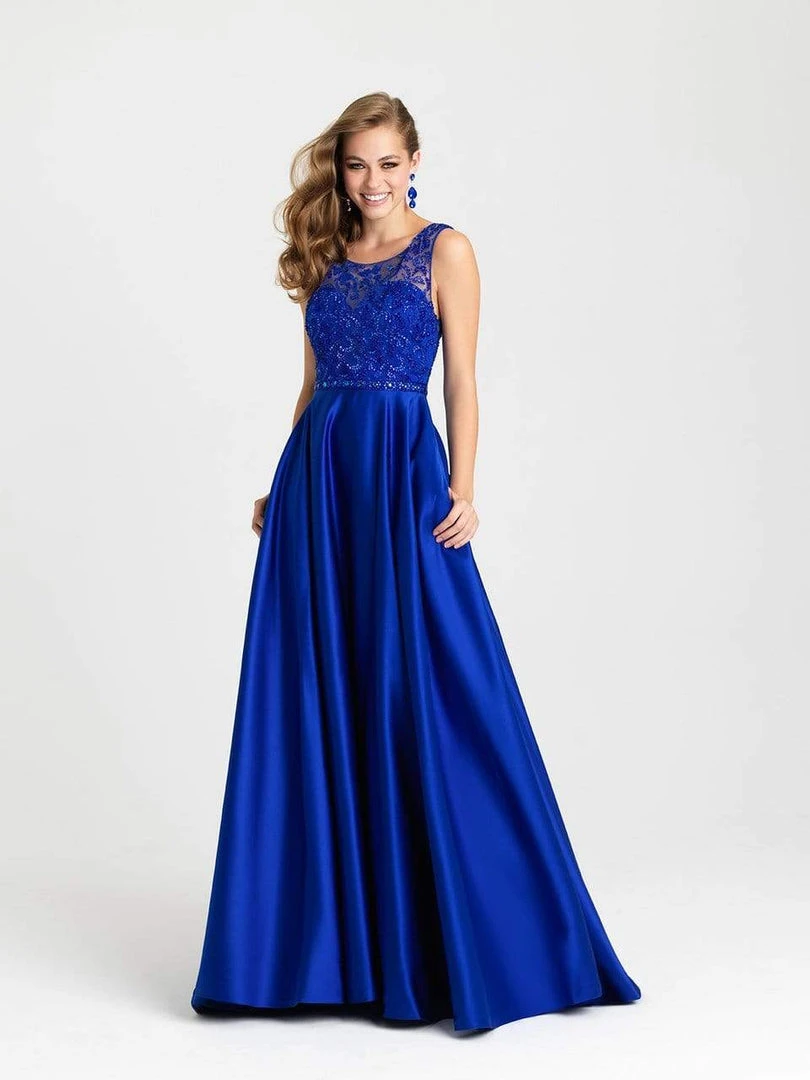Smooth satin is topped with delicate beadwork in this sleeveless gown.