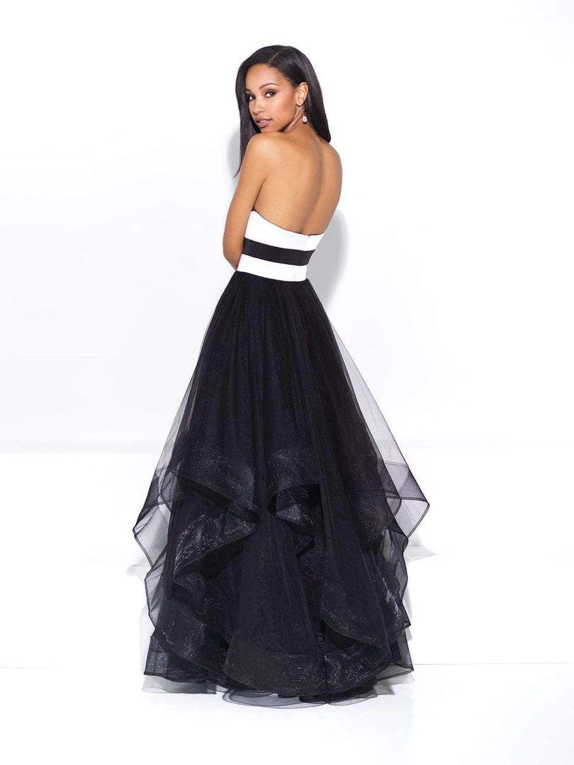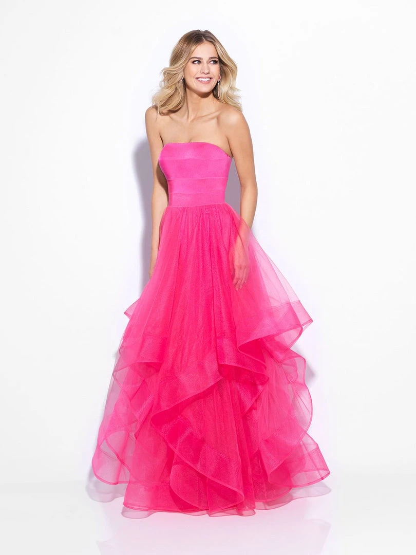 A simple strapless bodice is the perfect contrast for a sheer ruffled skirt.