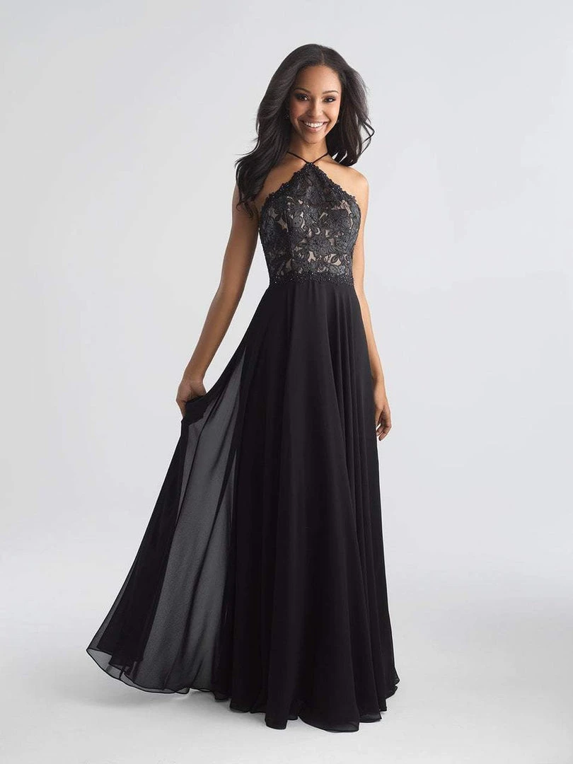 Look fresh and pretty in this lovely creation by Madison James 18-653. This chiffon halter versatile and fun dress features a romantic lace and fitted bodice. The A-line skirt flows to the floor with soft movements. The back highlights a keyhole cutout secured with a center zipper closure. You are more than fabulous in this Madison James design.