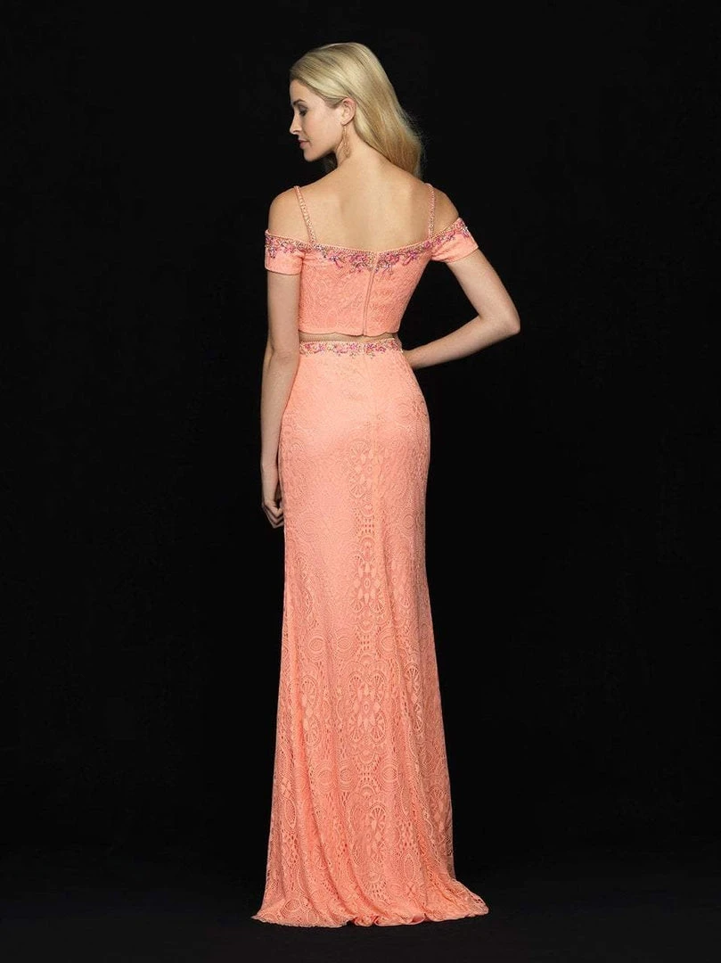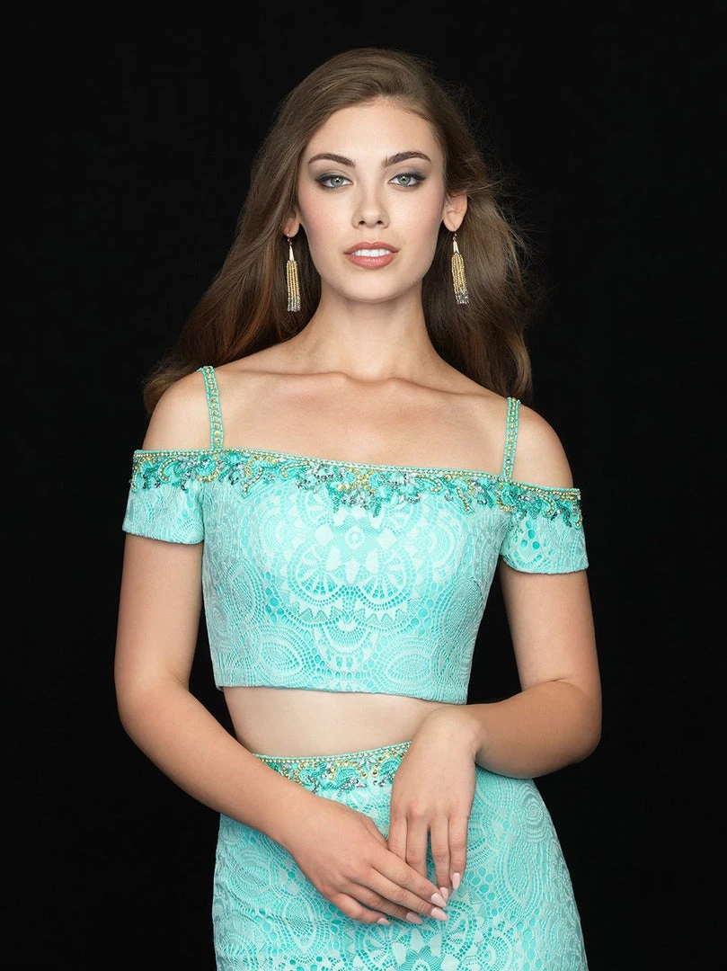 Make a delicious statement when you enter your event wearing this drop dead gorgeous, very unique gown by Madison James 18-670. This lace crafted two piece dress features a fitted crop top with an off shoulder neckline supported by thin straps that leads to the mid-open back. Multi-color embellishments frame the neckline and waist which gives way to the floor length sheath skirt. A mini train finishes this lovely stunner. Walk the red carpet in style wearing this exquisite evening gown by Madison James creation.