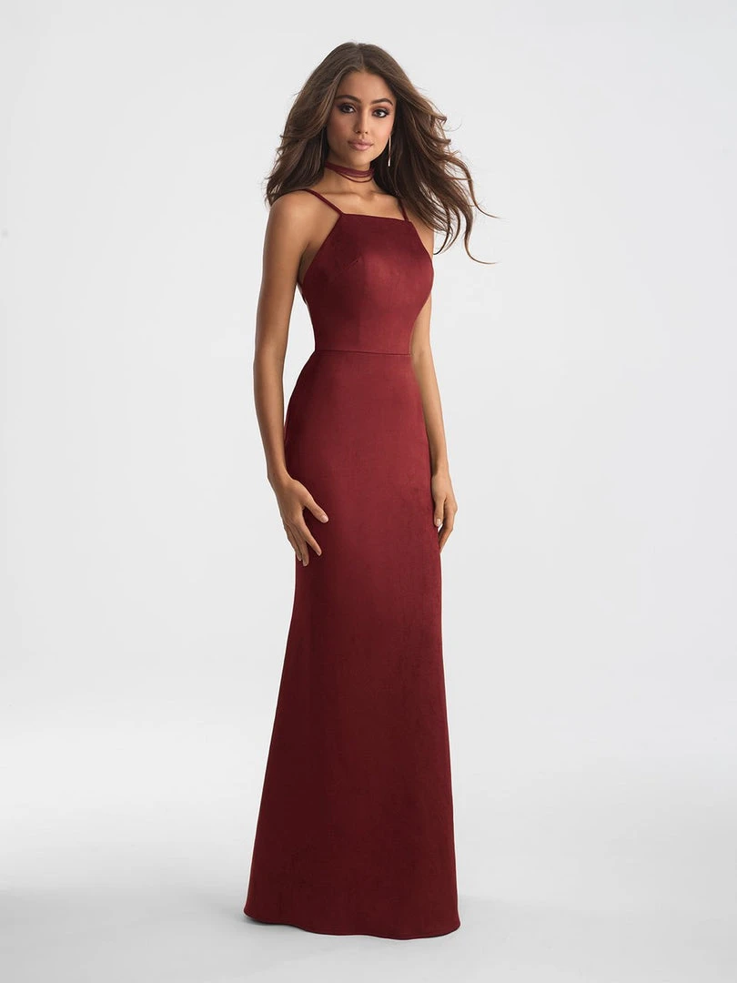 Stand out in every occasion with this daring creation by Madison James 18-713. A dress designed with a square neckline with thin straps connecting at the back exposing a skin revealing low strap open back design. With spaghetti straps and a sheath silhouette, this soft suede bodice dress is super dreamy. This Madison James creation will absolutely make you feel special!