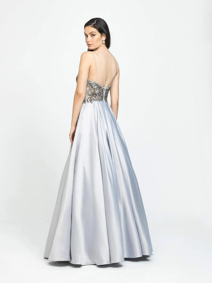 Show off your classy style when you wear this dress by Madison James 19-133. This satin gown glams in a sleeveless, deep V-neckline with fitted bodice lavishly ornate with bead embellishments. Styled with spaghetti straps, the back has a zipper closure. From the waist begins a full length A-line skirt. This Madison Jamesis a stunning look for your evening occasion.