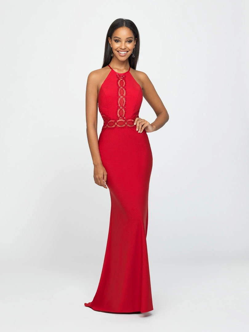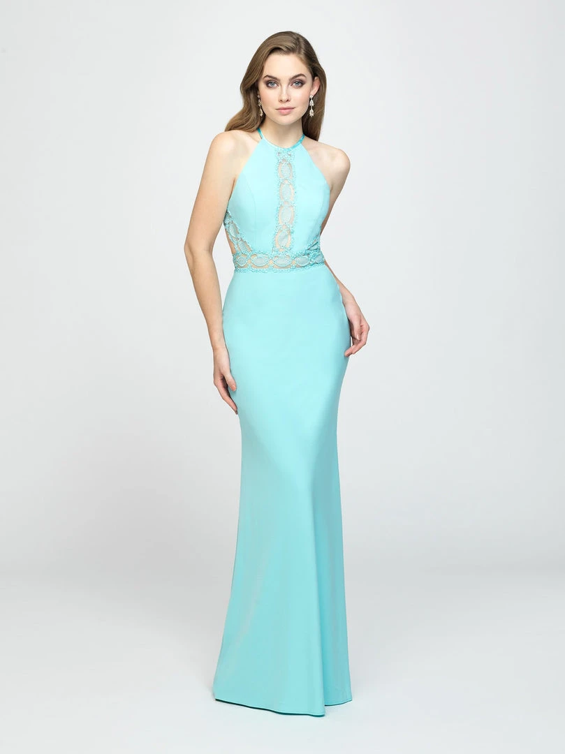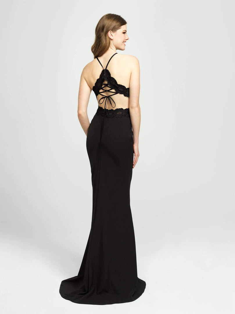 Class and sophistication are achieved in this sleek design by Madison James 19-184. This lace and stretch satin dress fashions a sleeveless, halter neckline with fitted bodice designed with a strappy open back. The skirt has a fit and flare silhouette and finishes the look in a sweep train. Let yourself be seduced by this feminine and unique dress collection of spectacular evening dresses, presented by Madison James.