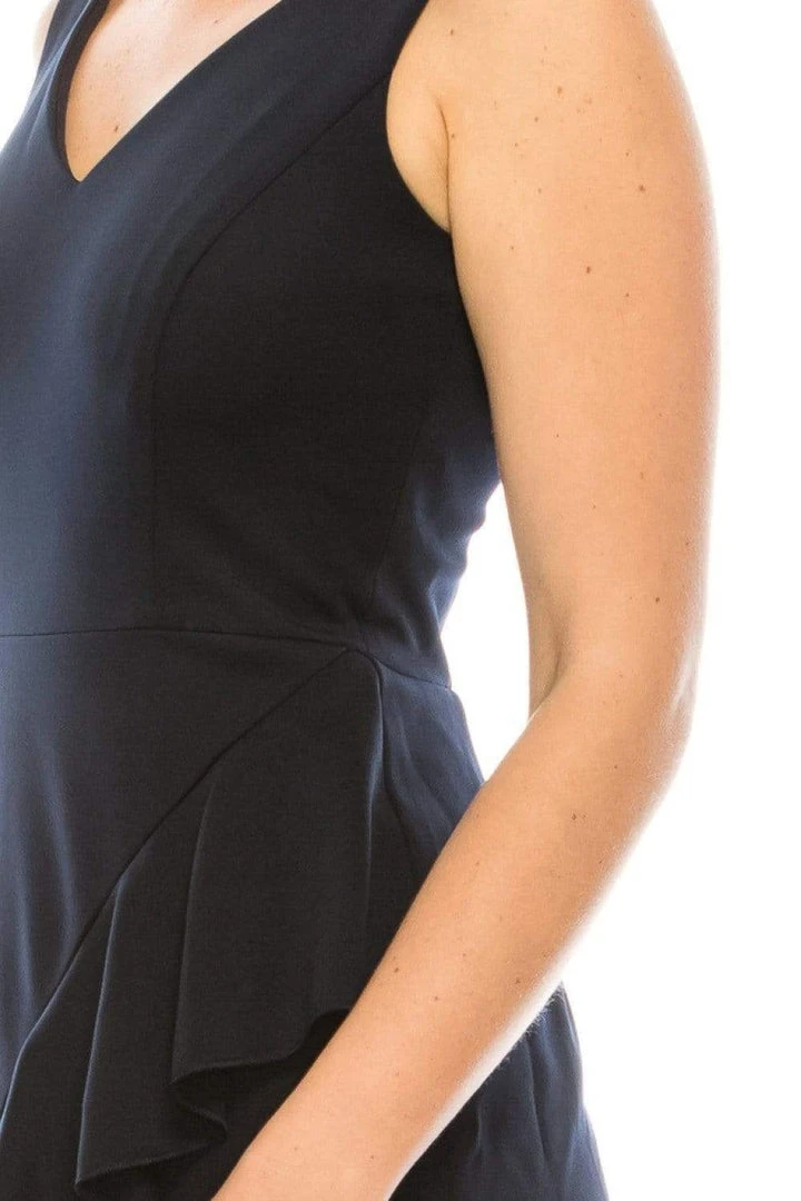 Show off your elegant style and soft curves in this pretty Maggy London G3907M dress. This bold toned scuba dress highlights a seam sculpted fitted sleeveless bodice with mirrored V neckline and back, featured with zig-zag ruffle accent along the skirt, finishing with a straight knee length straight hem. Bound to create admiring impression in this style by Maggy London.
